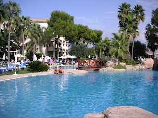 Today was a transition day - checking out of the Valparaiso Palace in Palma and crossing the island to the northeast corner of the island to Alcudia Bay. Our 55 mile route took us along lovely rural roads with stone walls on either side - rolling terrain with no real climbs. We stopped at the Kollflex leather factory and outlet where I found a funky leather calf hair belt with a silver buckle. The outlet also had a cappuchino bar! We stopped in Pollenca for lunch - looking for pizza - but the shop was closed. Instead we had lunch at a sandwich bar with an outdoor terrace - I stopped in at a grocery store and bought some turkey, a nectarine and plain yogurt. Our hotel for the next few days was the Parc Naturelle - owned by the same Gruphotel as the Valparaiso - another 5 star, very modern and beuatiful grounds. The hotel was situated on the water with its own beach. We had a nice side view of the water from our room. And the same fantastic spa facilities. I was tired and took a short nap before dinner at the hotel.